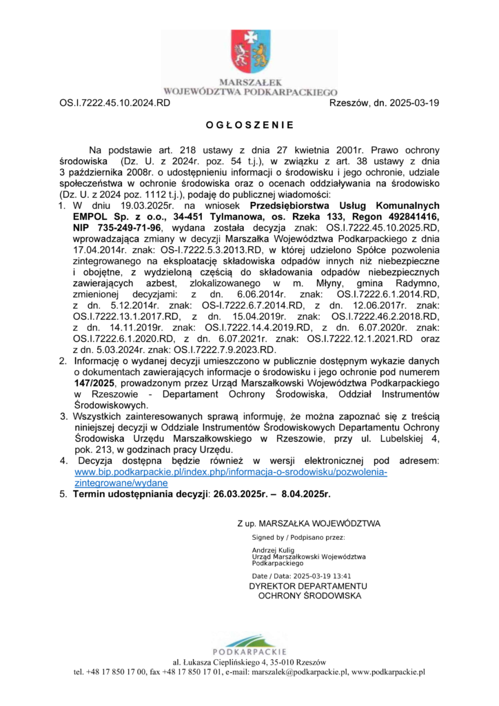 Ogłoszenie Marszałka Województwa Podkarpackiego